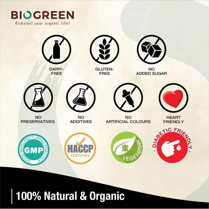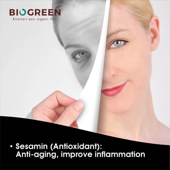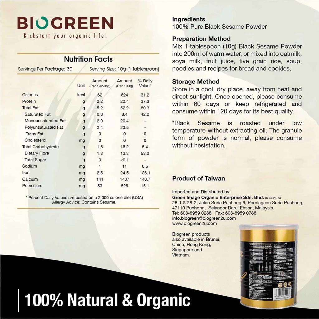 Biogreen 100% Pure Black Sesame Powder is ground from premium, whole black sesame seeds and roasted at low temperature to retain its nutrients, aroma and taste. Biogreen 100% Pure Black Sesame Powder is rich in fibre, calcium and iron, which are essential for healthy gut, bones and blood circulation. It is a good source of sesamin, a type of antioxidants which may help to reduce free radicals, regulate blood cholesterol and blood pressure.