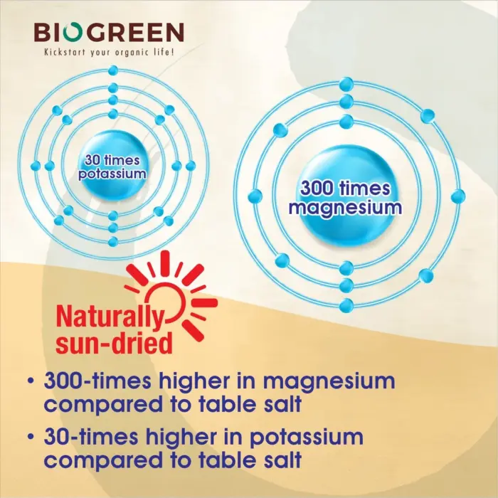 Biogreen New Zealand Ocean Balance Organic Sea Salt is harvested from the unpolluted clear sea water of the Great Southern Ocean that sweeps through the East Coast of New Zealand and into the solar salt field. The sea water is naturally sun- and wind-dried, after which the sea salt is carefully collected to retain the minerals. New Zealand Ocean Balance Organic Sea Salt is 300- and 30- times higher in magnesium and potassium, respectively than that of table salt*. These minerals may work synergistically in regulating sodium balance in our body.
