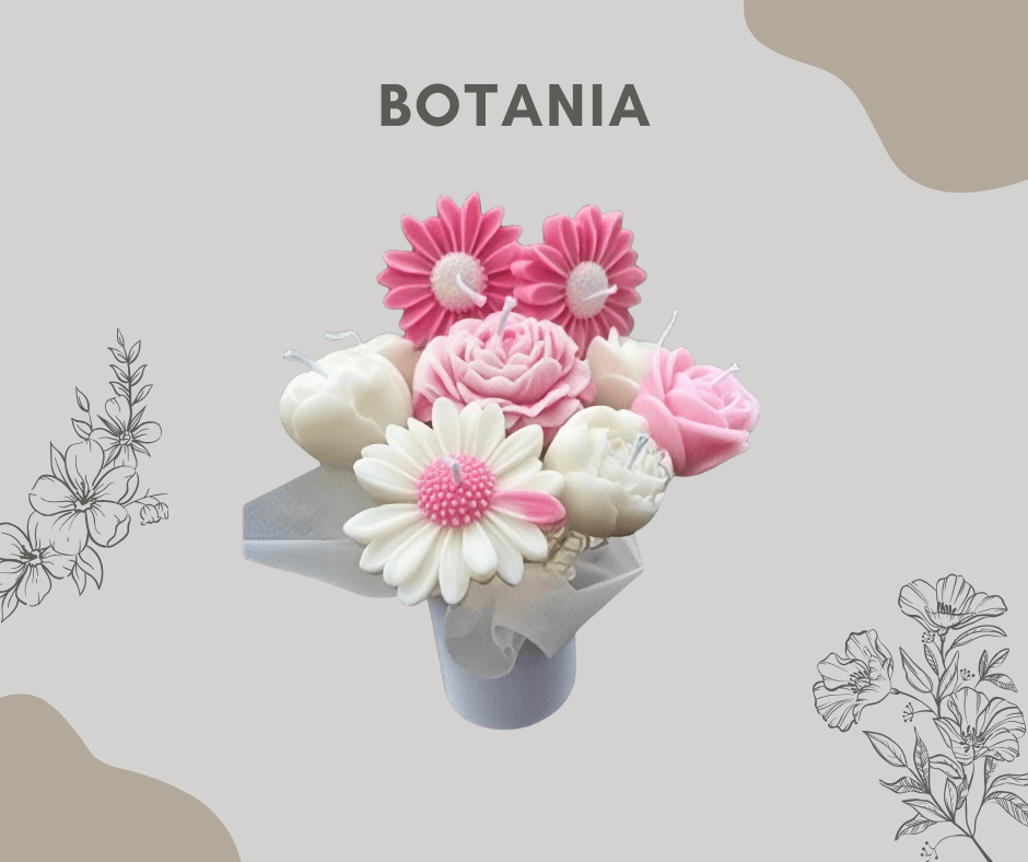 Inspired by the beauty of a blooming garden, the Botania Candle Bouquet is a graceful blend of floral artistry and soothing candlelight. Featuring delicately crafted peony candles paired with charming daisy candles, this bouquet captures the freshness, softness, and elegance of nature in full bloom. Made with premium soya wax and ylang – ylang and rose essential oil.