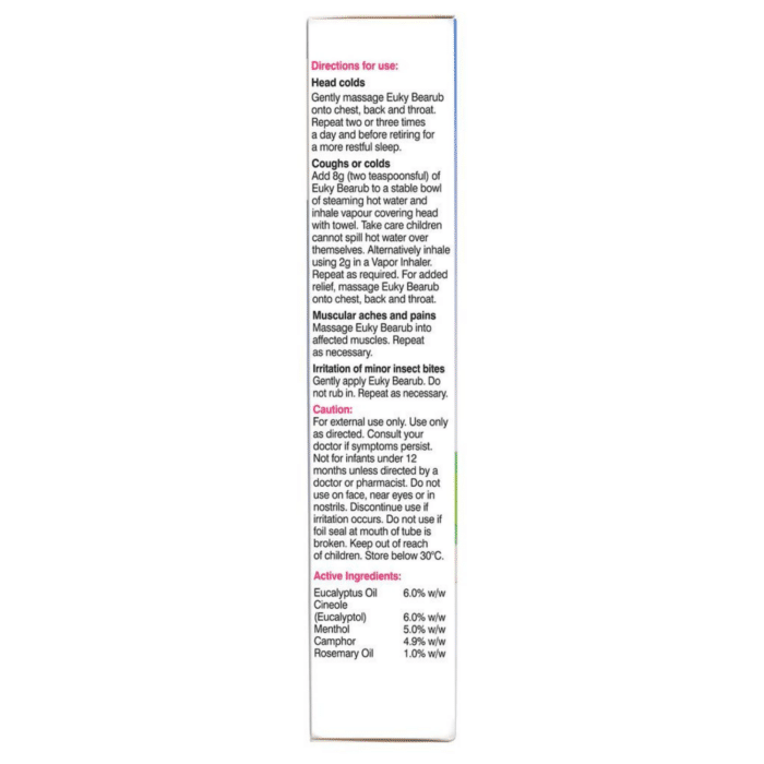 A gentle, soothing Australian Eucalyptus chest rub that helps relieve a stuffy nose, irritating cough associated with colds and general aches and pains. Used before sleep, it helps make breathing easier. Although adult strength, it is gentle on sensitive skin.