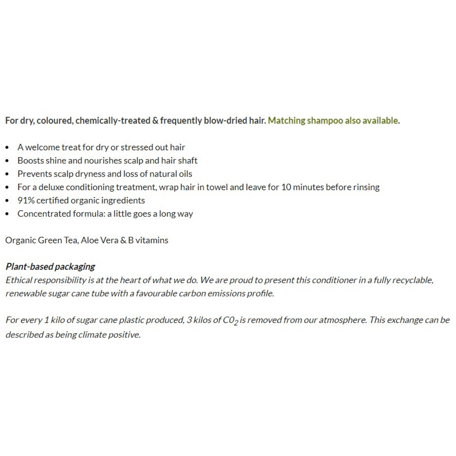Ethical responsibility is at the heart of what we do. We are proud to present this conditioner in a fully recyclable, renewable sugar cane tube with a favourable carbon emissions profile.