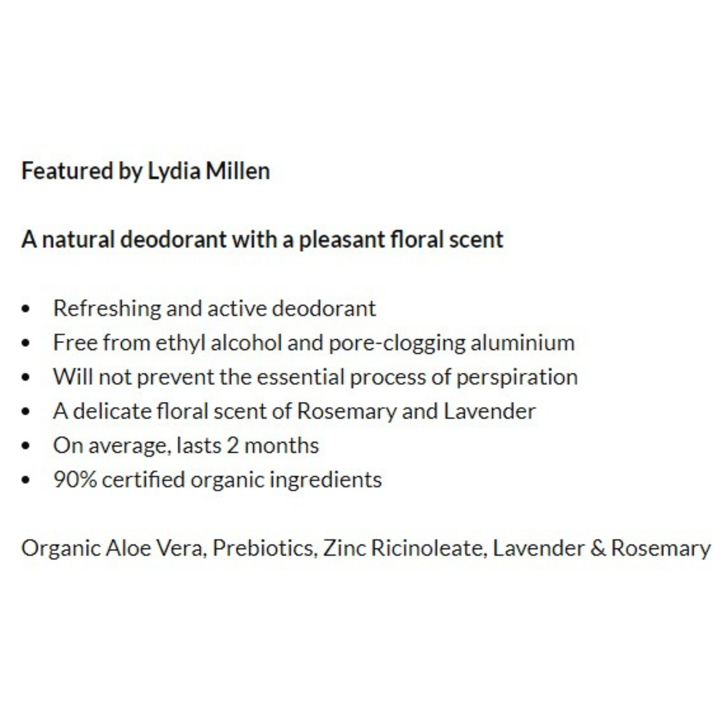 Organic Aloe Vera, Prebiotics, Zinc Ricinoleate, Lavender & Rosemary