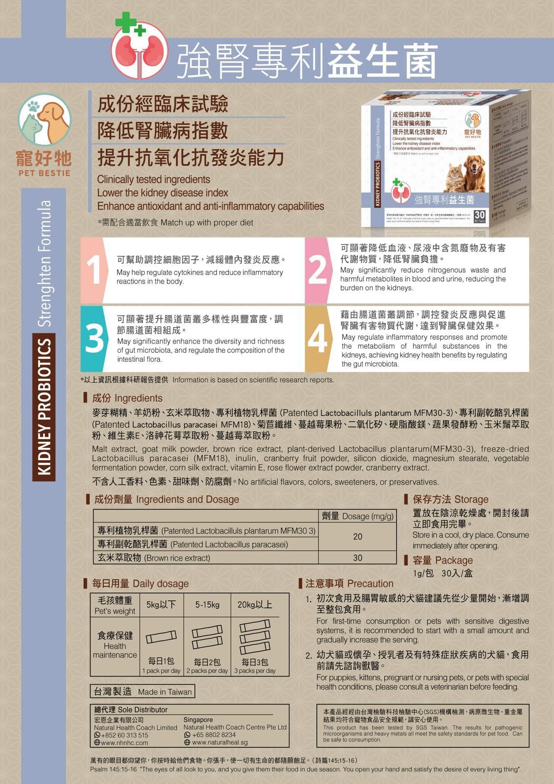 Our Kidney-Support Probiotic is formulated with clinically tested strains to help reduce kidney burden, support anti-inflammatory response, and improve gut microbiota balance. Made with patented probiotics and natural brown rice extract, it’s free from artificial additives and SGS-tested for safety. Suitable for daily use with simple weight-based dosing to support your pet’s overall kidney health.