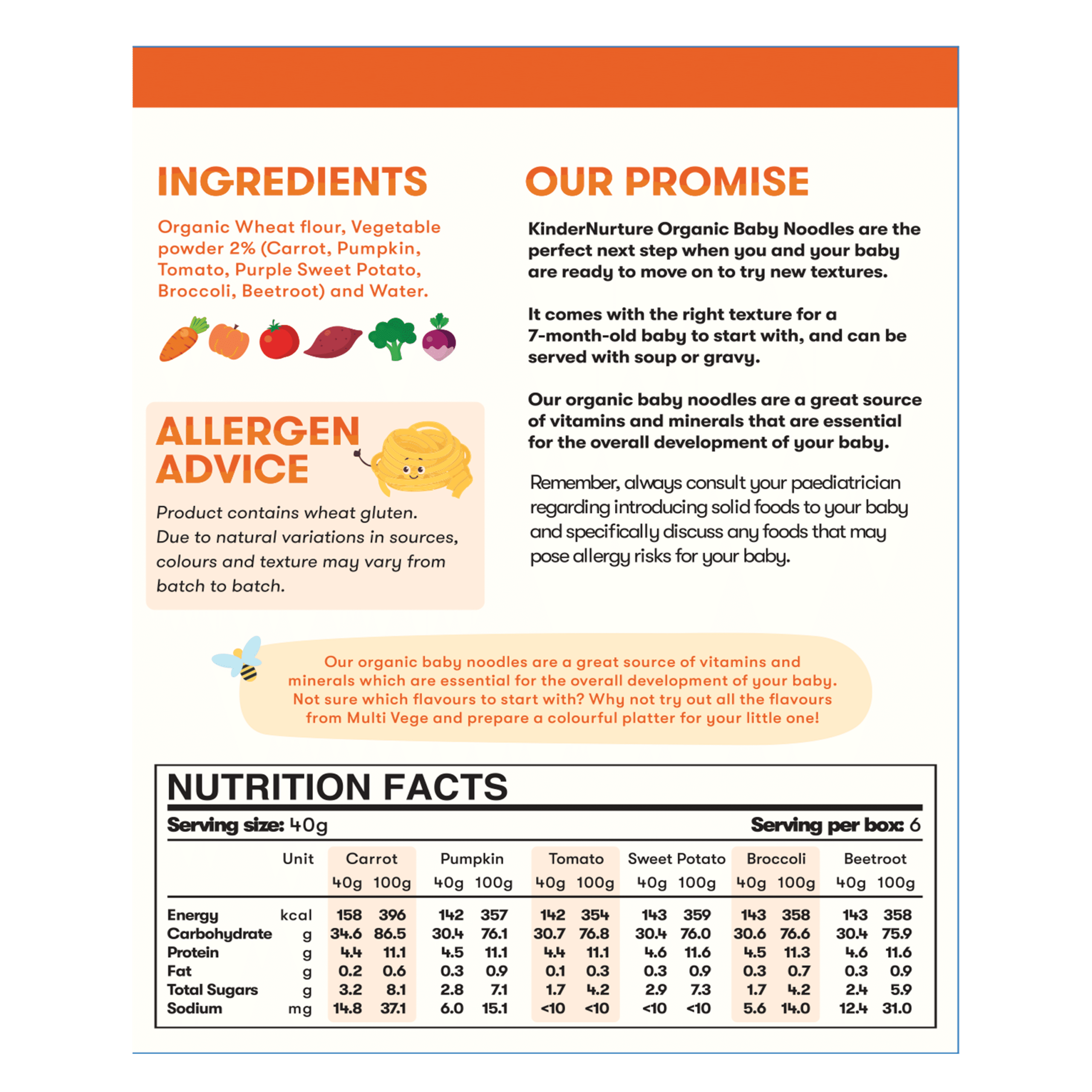 Cook noodles until soft, mash lightly if needed, and serve warm. Suitable for babies 6 months and older. Always supervise your baby while eating. Perfect for introducing a variety of vegetable flavours in one pack.