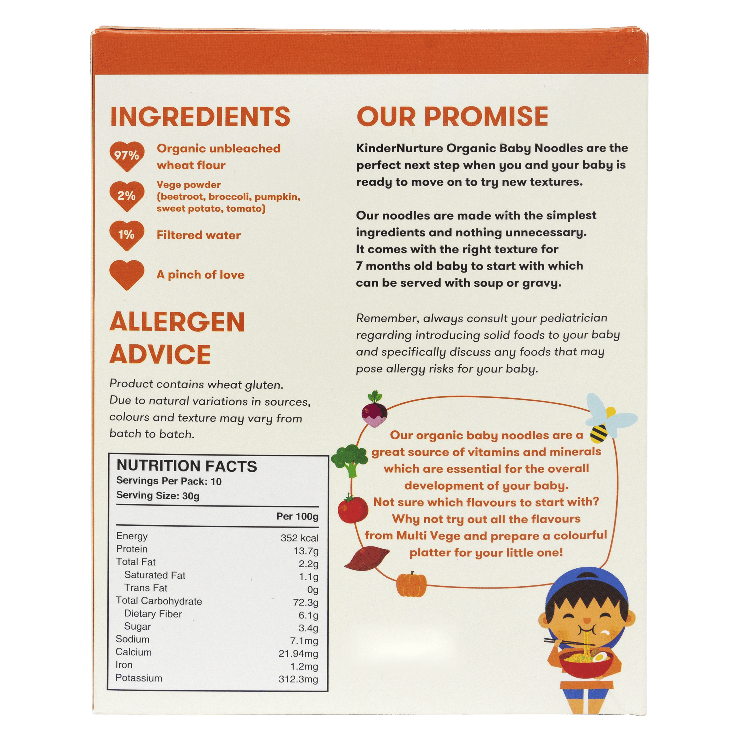 Our organic baby noodles are a great source of vitamins and minerals which are essential for the overall development of your baby. Not sure which flavours to start with? Why not try out all the flavours from Multi Vege and prepare a colourful platter for your little one!