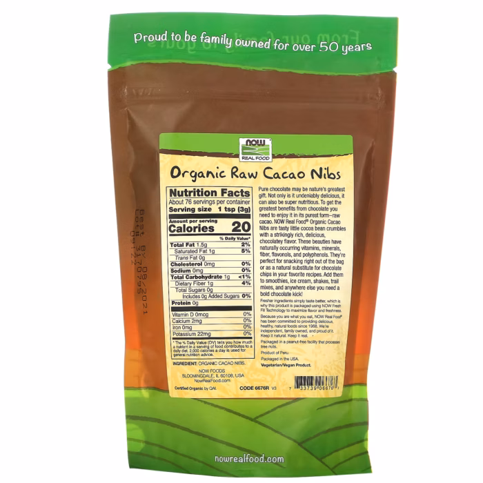 Pure chocolate may be nature’s greatest gift. Not only is it undeniably delicious, it can also be super nutritious. To get the greatest benefits from chocolate you need to enjoy it in its purest form-raw cacao. NOW Real Food® Organic Cacao Nibs are tasty little cocoa bean crumbles with a strikingly rich, delicious, chocolatey flavor. These beauties have naturally occurring vitamins, minerals, fiber, flavonols, and polyphenols. They’re perfect for snacking right out of the bag or as a natural substitute for chocolate chips in your favorite recipes. Add them to smoothies, ice cream, shakes, trail mixes, and anywhere else you need a bold chocolate kick!