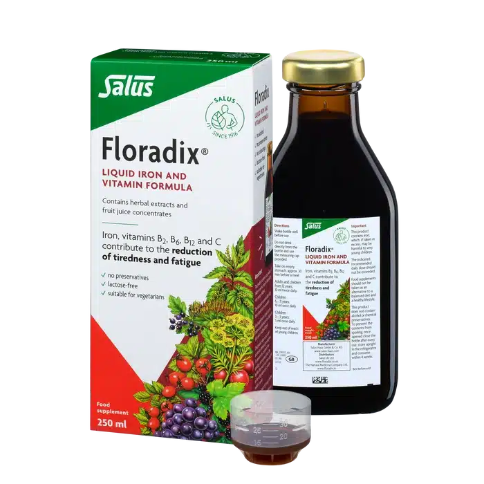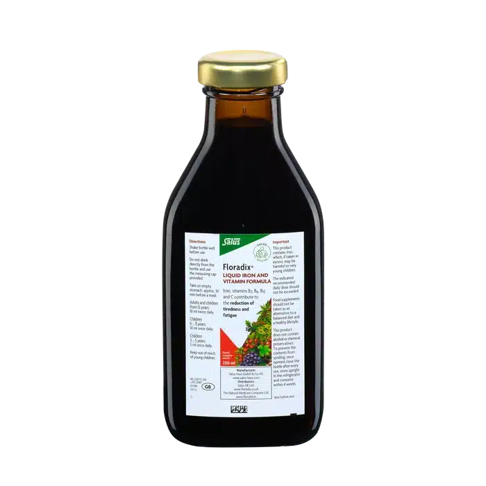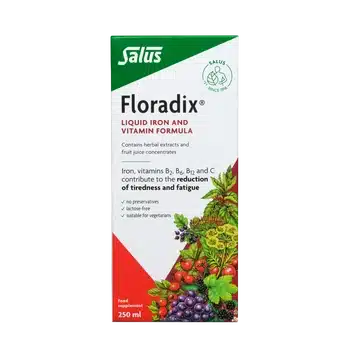 Floradix contains organic iron from ferrous gluconate, vitamins B2, B6, B12 and C which contribute to the reduction of tiredness and fatigue and to normal energy-yielding metabolism.