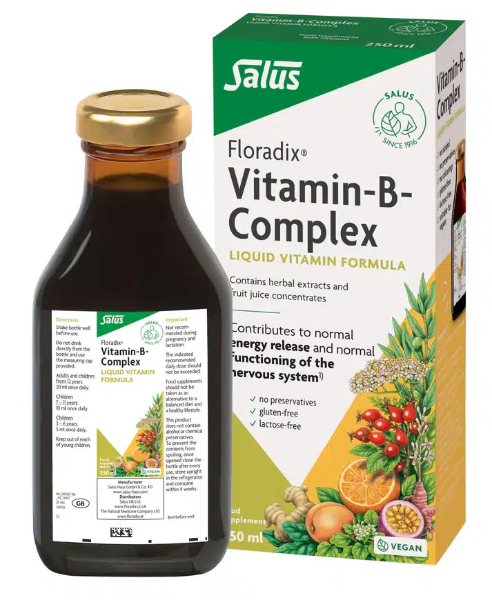 Aqueous herbal extract (45%) from: yarrow herb (Achillea millefolium), water cress herb (Nasturium officinale), spinach leaf (Spinacia oleracea), olive leaf (Olea europaea), galangal rhizome (Alpinia galanga), ginger rhizome (Zingiber officinale), rosehip peel (Rosa canina). Mixture of fruit juice concentrates (36%) of: pear, apricot, orange, carob extract, passion fruit, lemon, grape, apple. Water, thickener: locust bean gum, nicotinamide (niacin), riboflavin (as riboflavin 5′- phosphate, sodium), vitamin B6 (as pyridoxine hydrochloride), thiamin (as thiamin hydrochloride), biotin, vitamin B12 (methylcobalamine), natural flavours.
