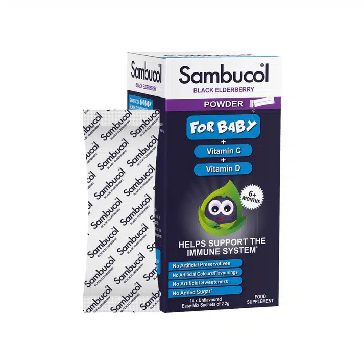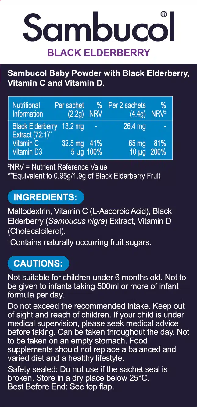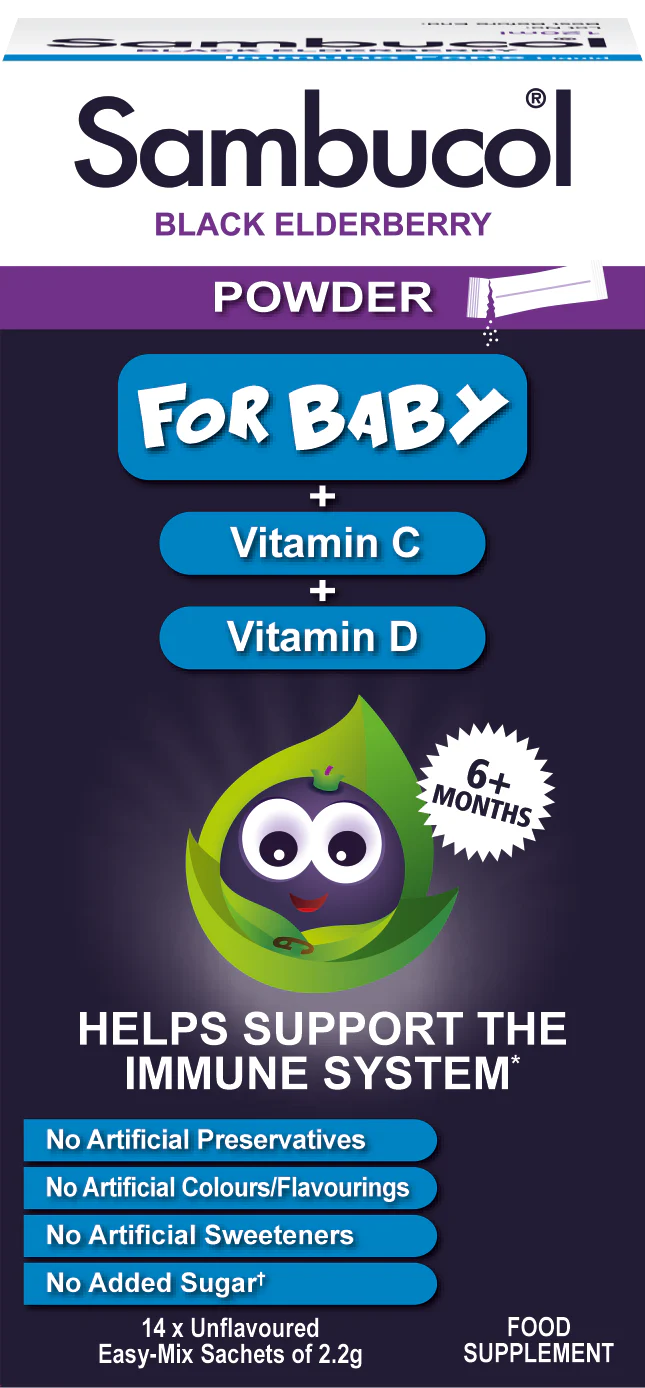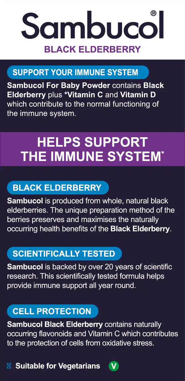 Help support your immune system with Sambucol Baby Powder containing Black Elderberry plus Vitamin C and Vitamin D3.