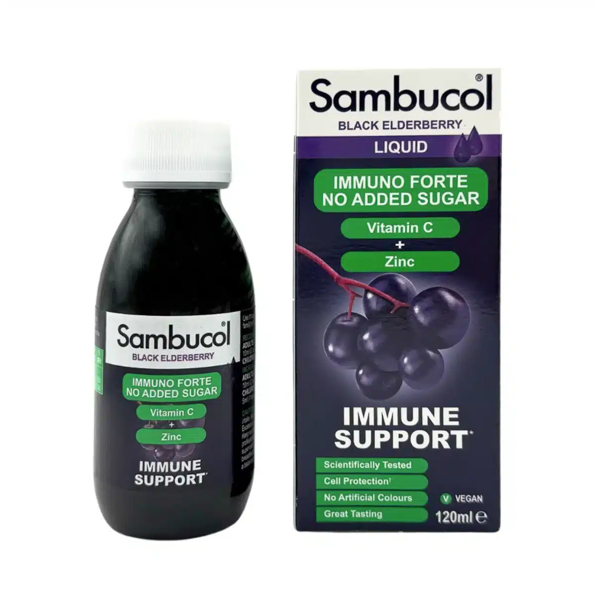 Made for everyday immune support, Sambucol Immuno Forte Liquid combines the power of black elderberries, Vitamin C, and Zinc in a great-tasting berry-flavoured liquid — with no added sugar.
