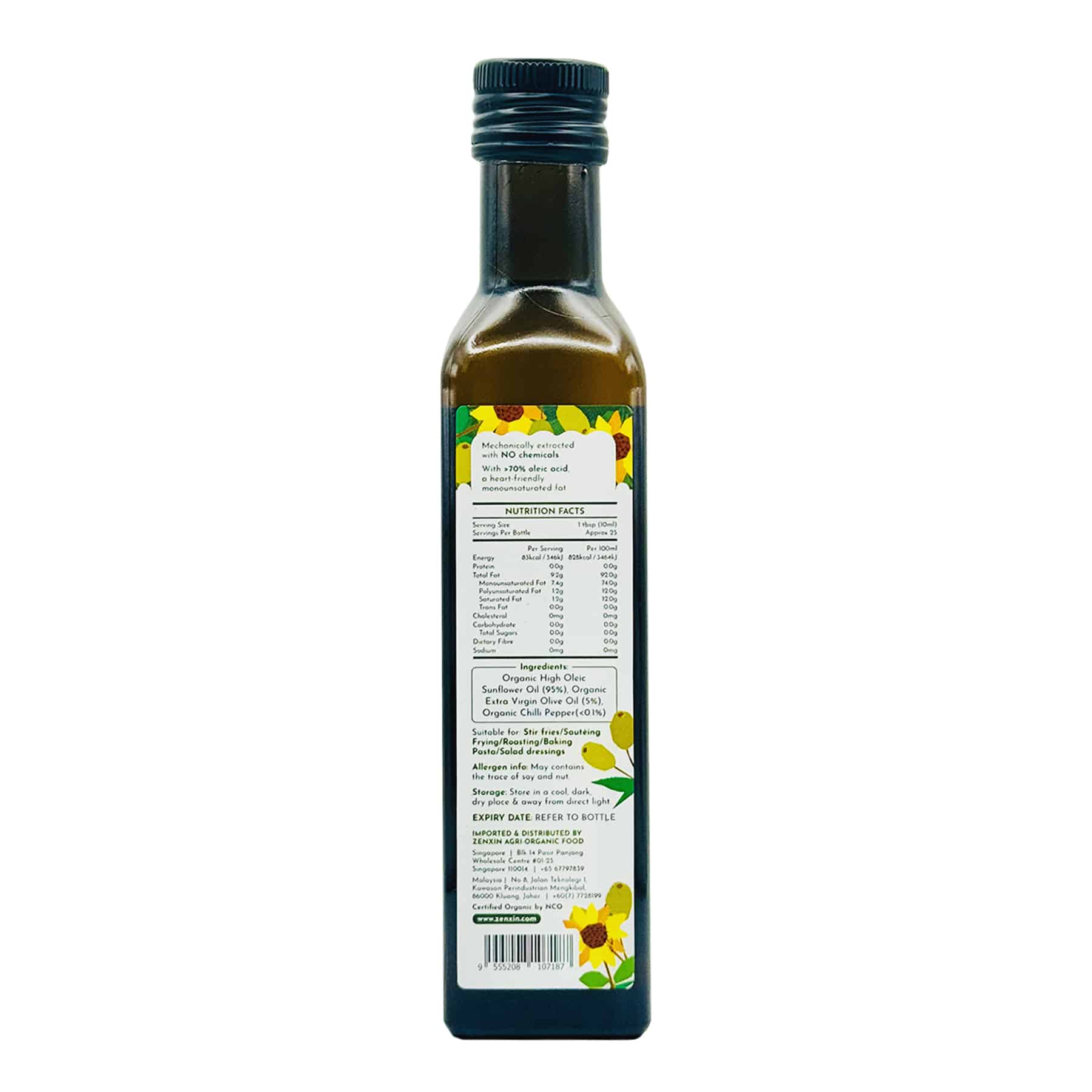 Organic High Oleic Sunflower Oil (95%), Organic Extra Virgin Olive Oil (5%), Organic Chilli Pepper (<0.1%)