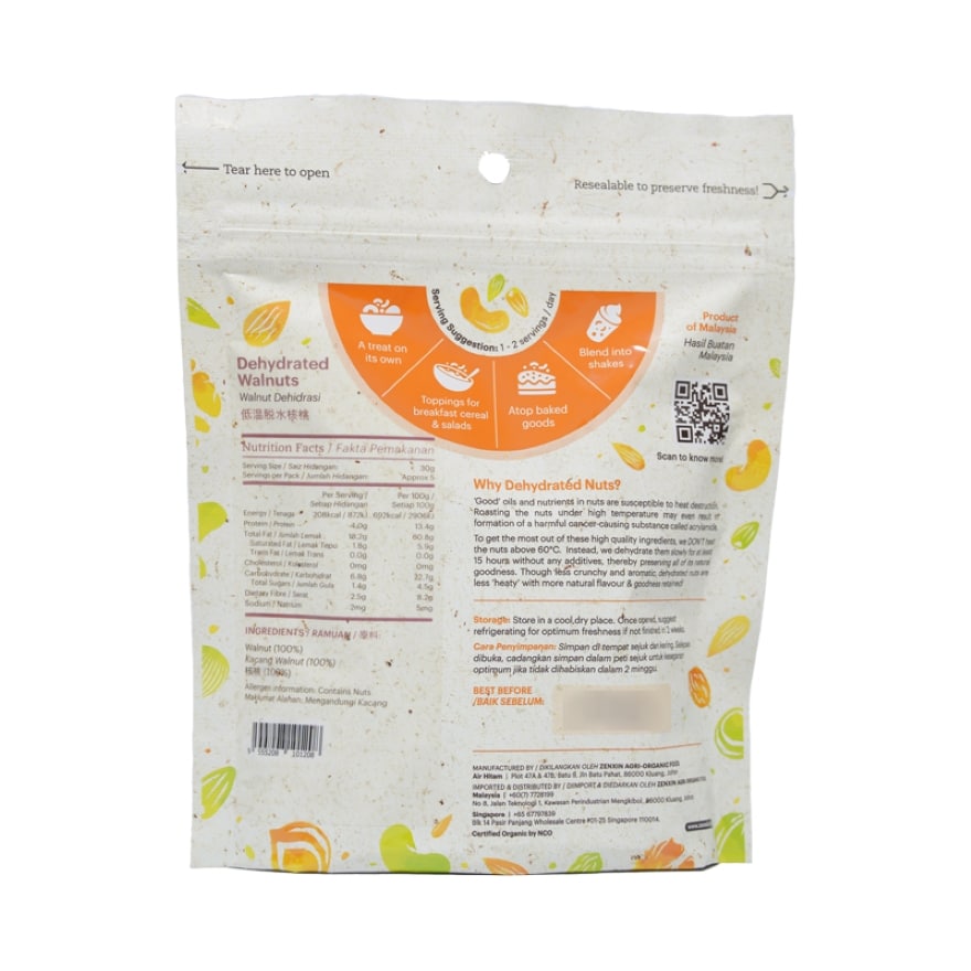 NOT baked NOT roasted, Simply Natural’s Dehydrated Walnut is dehydrated at a low temperature of 60°C for at least 15 hours to retain the heat-vulnerable ‘good’ fats present in nuts. It is made in XIN’s very own NASAA, ISO22000: 2018 & HACCP certified facility, with carefully selected premium quality ingredients, and guaranteed FREE from artificial additives, preservatives and colourings. You may taste the natural goodness of the unsalted & unsweetened walnuts of USA origin, and we encourage you to incorporate them as part of your healthy diet. Less heaty, more goodness, definitely one of the best vegan & keto-friendly snacks of choice!