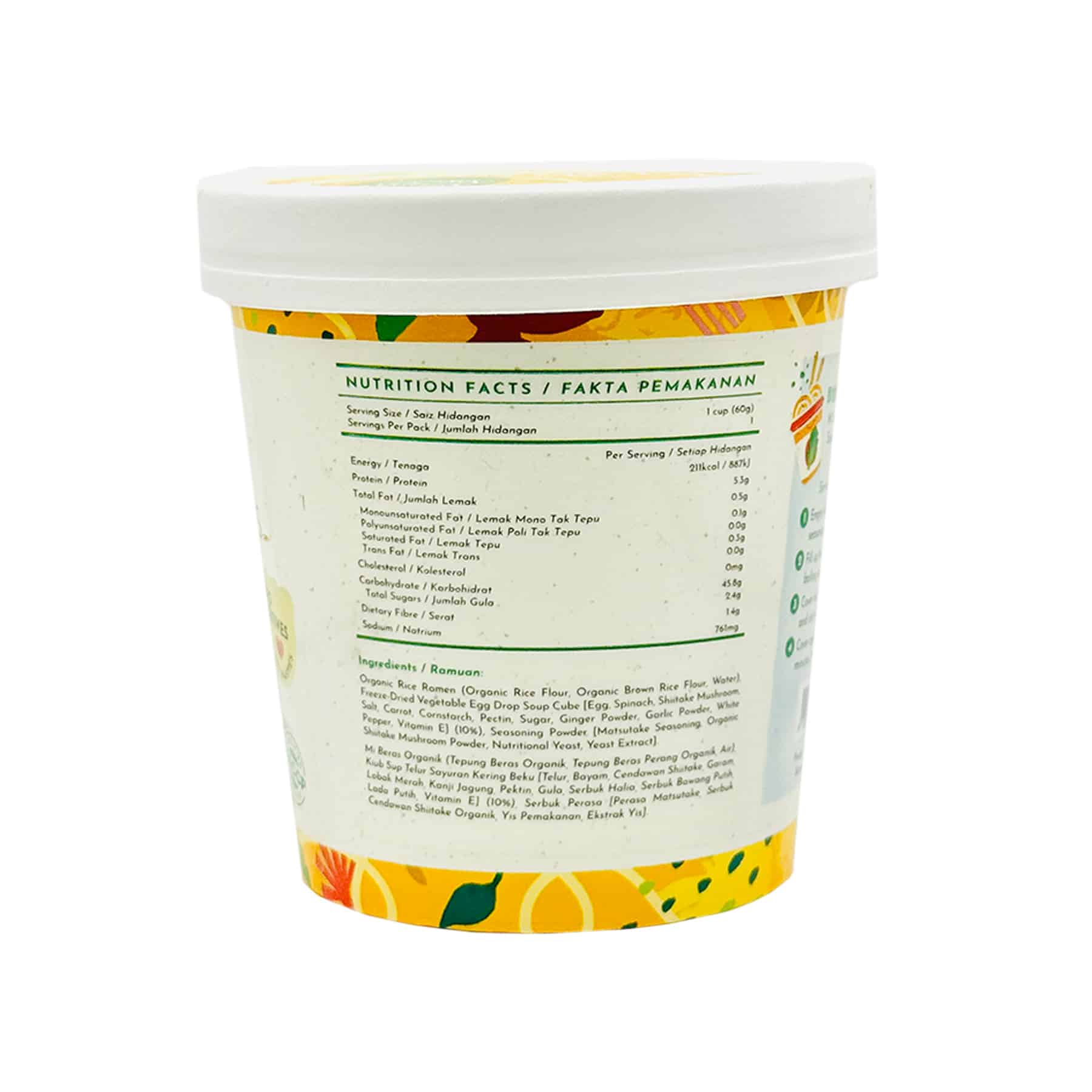 Our Instant Fresh Vegetables Egg Drop Ramen is a clean and nourishing choice—completely wheat-free, gluten-free and made without MSG or any artificial additives. Comes with non-fried organic rice ramen, the soup base is prepared using real ingredients like egg, mushrooms, and vegetables, then freeze-dried to preserve their natural nutrients and deliver a fresh, homemade taste. A healthy balanced meal ready in just 8 minutes, it’s a super convenient meal solution for busy adults. Suitable for ovo-vegetarians, and gentle enough for both kids and the elderly to enjoy.