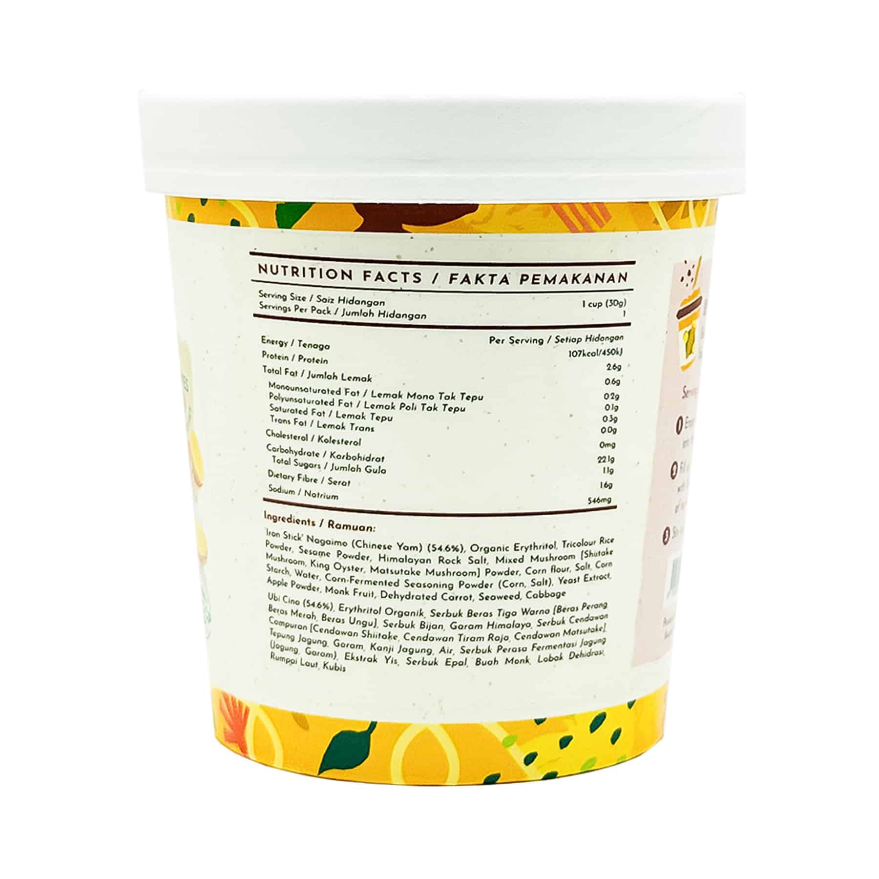 “Iron Stick” Nagaimo (Chinese Yam) (54.6%), Organic Erythritol, Tricolour Rice Powder, Sesame Powder, Himalayan Rock Salt, Mixed Mushroom Powder [Shiitake Mushroom, King Oyster, Matsutake Mushroom], Corn Flour, Salt, Corn Starch, Water, Corn-Fermented Seasoning Powder (Corn, Salt), Yeast Extract, Apple Powder, Monk Fruit, Dehydrated Carrot, Seaweed, Cabbage