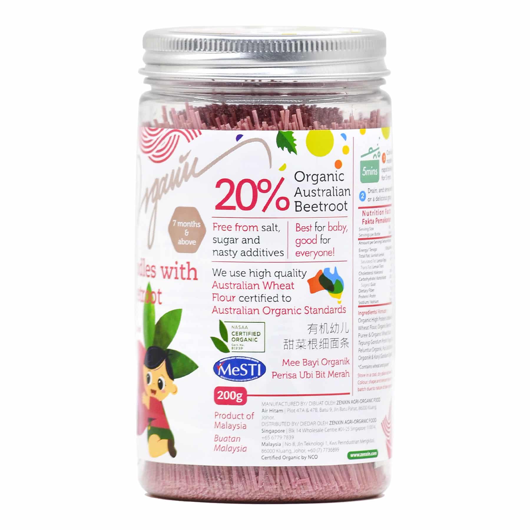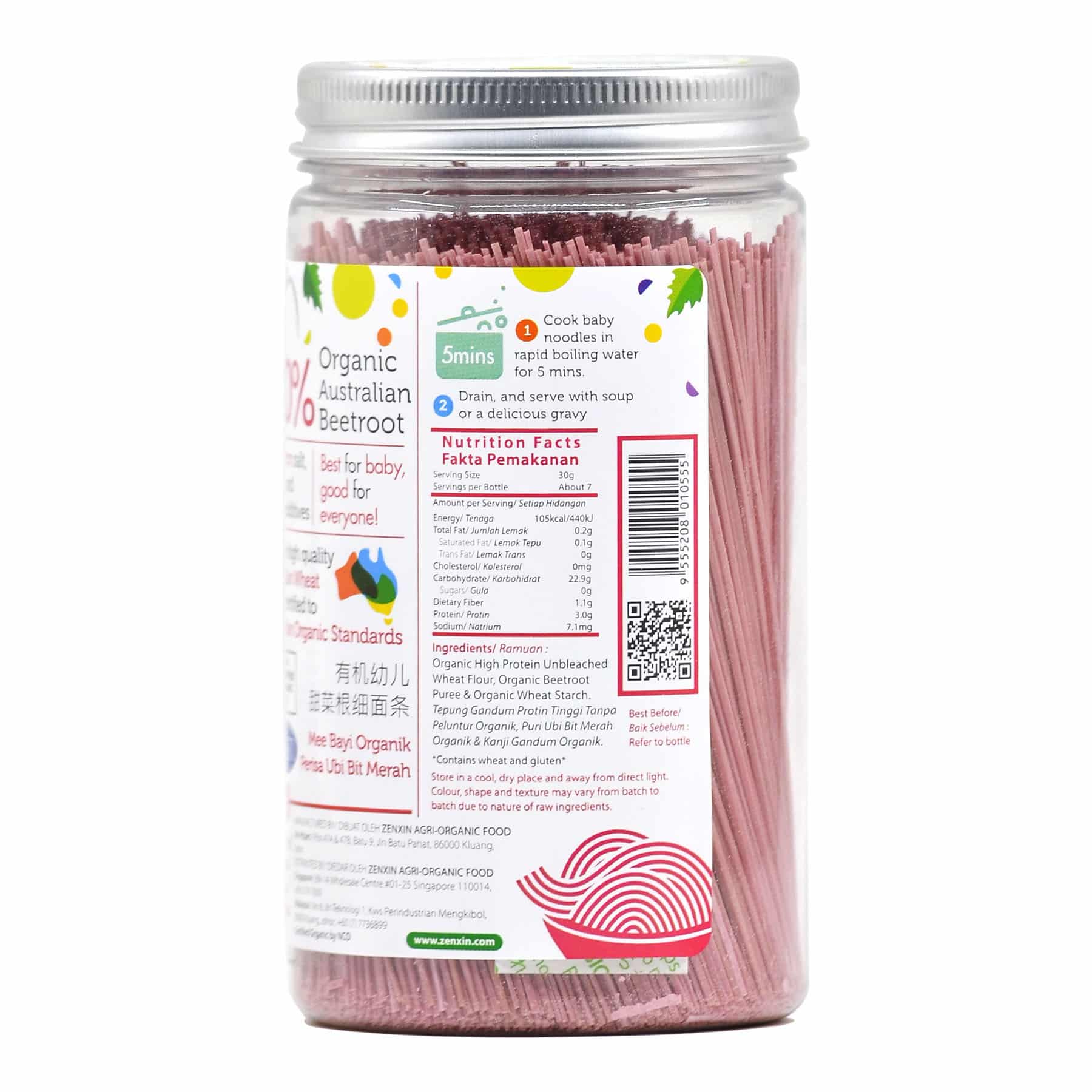 This Simply Natural organic baby noodle is handmade using premium ingredients: 20% fresh organic beetroot puree and high protein unbleached flour. It is naturally colourful, nutritious and fully organic. Thinness of 1mm, easy for congestion. Perfect choice for kids. No added sugar, salt or MSG. Absolutely ZERO preservatives, additives, colourings & flavourings. Free from harmful chemical residuals.