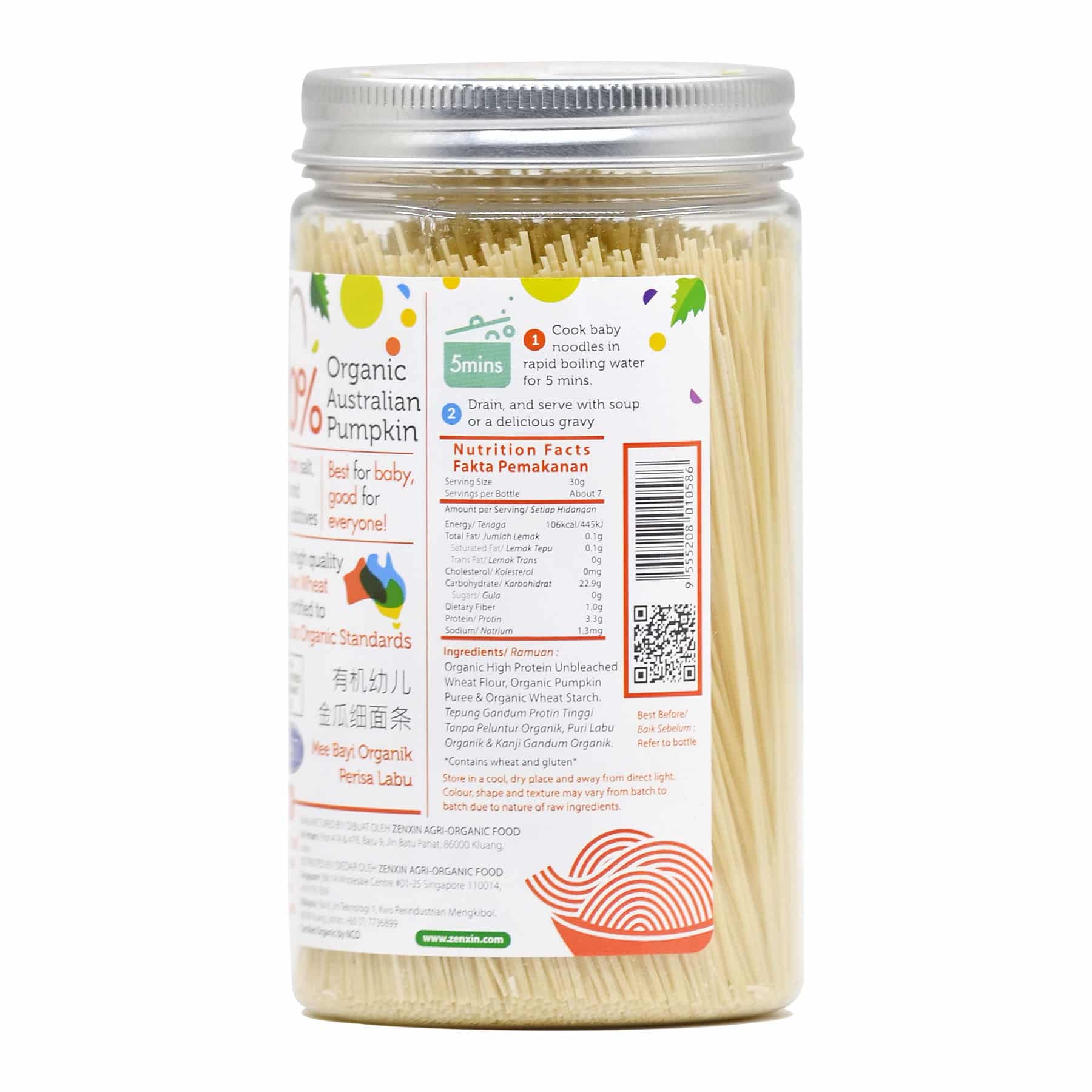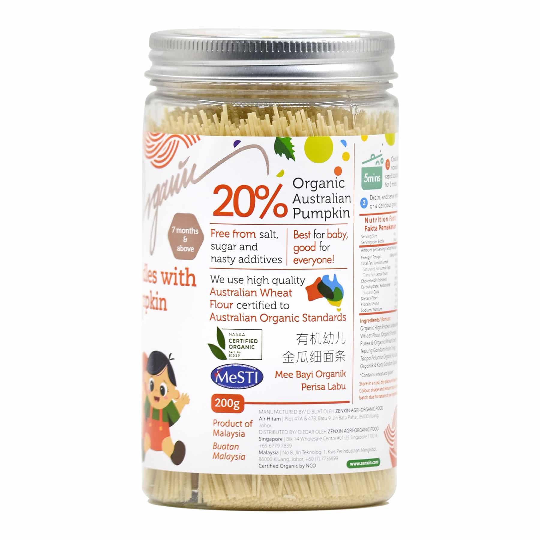 This Simply Natural organic baby noodle is handmade using premium ingredients: 20% fresh organic pumpkin puree and high protein unbleached flour. It is naturally colourful, nutritious and fully organic. Thinness of 1mm, easy for congestion. Perfect choice for kids. No added sugar, salt or MSG. Absolutely ZERO preservatives, additives, colourings & flavourings. Free from harmful chemical residuals.