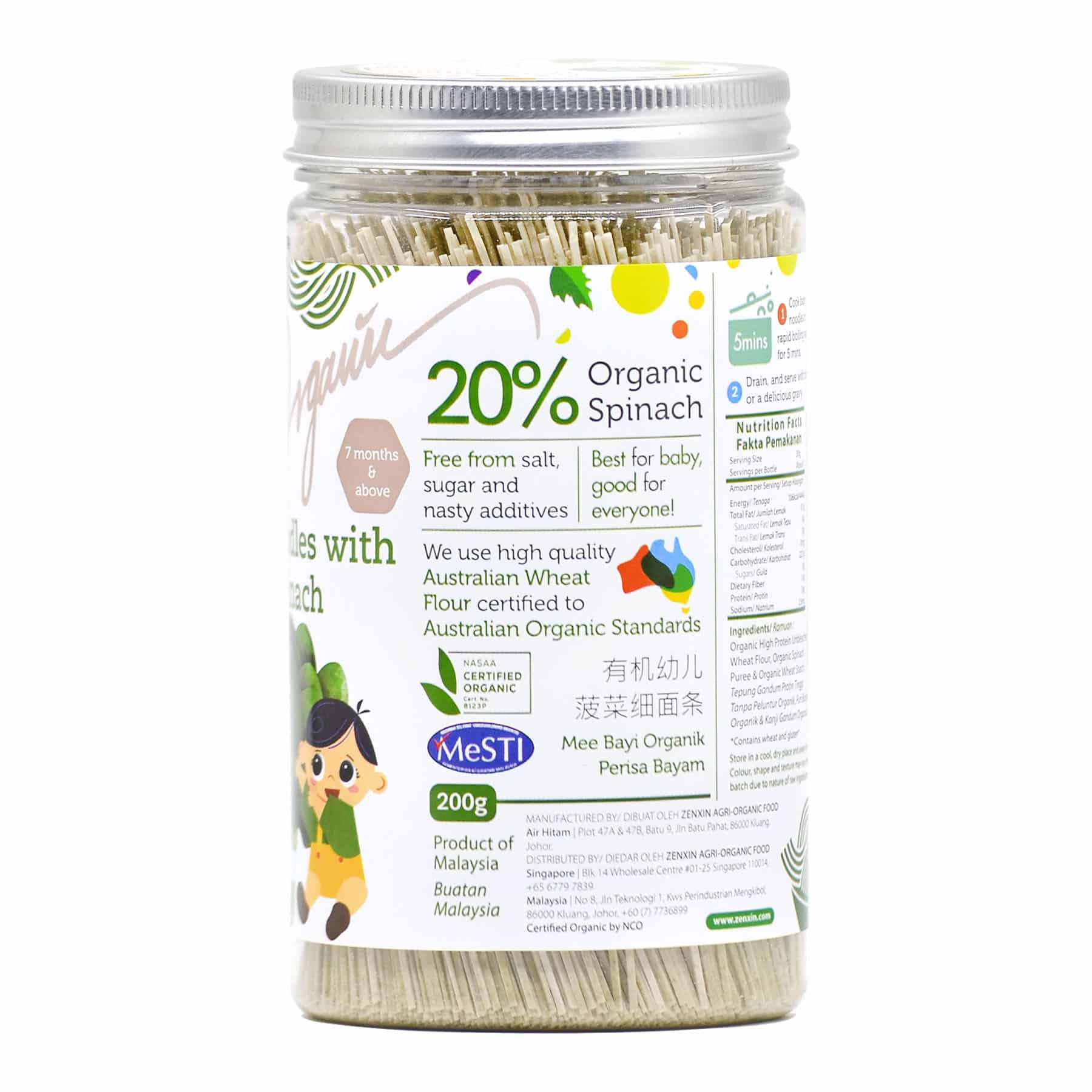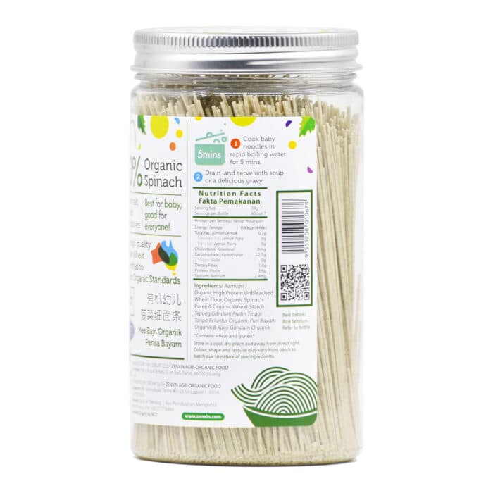 This Simply Natural organic baby noodle is handmade using premium ingredients: 20% fresh organic spinach puree and high protein unbleached flour. It is naturally colourful, nutritious and fully organic. Thinness of 1mm, easy for congestion. Perfect choice for kids. No added sugar, salt or MSG. Absolutely ZERO preservatives, additives, colourings & flavourings. Free from harmful chemical residuals.