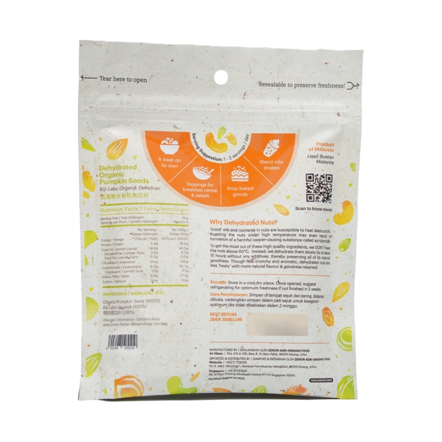 NOT baked NOT roasted, Simply Natural’s Dehydrated Pumpkin Seed is dehydrated at a low temperature of 60°C for at least 15 hours to retain the heat-vulnerable ‘good’ fats present in nuts. It is made in XIN’s very own NASAA, ISO22000: 2018 & HACCP certified facility, with carefully selected premium quality ingredients, and guaranteed FREE from artificial additives, preservatives and colourings. You may taste the natural goodness of the unsalted & unsweetened seeds, and we encourage you to incorporate them as part of your healthy diet. Less heaty, more goodness, definitely one of the best vegan & keto-friendly snacks of choice!