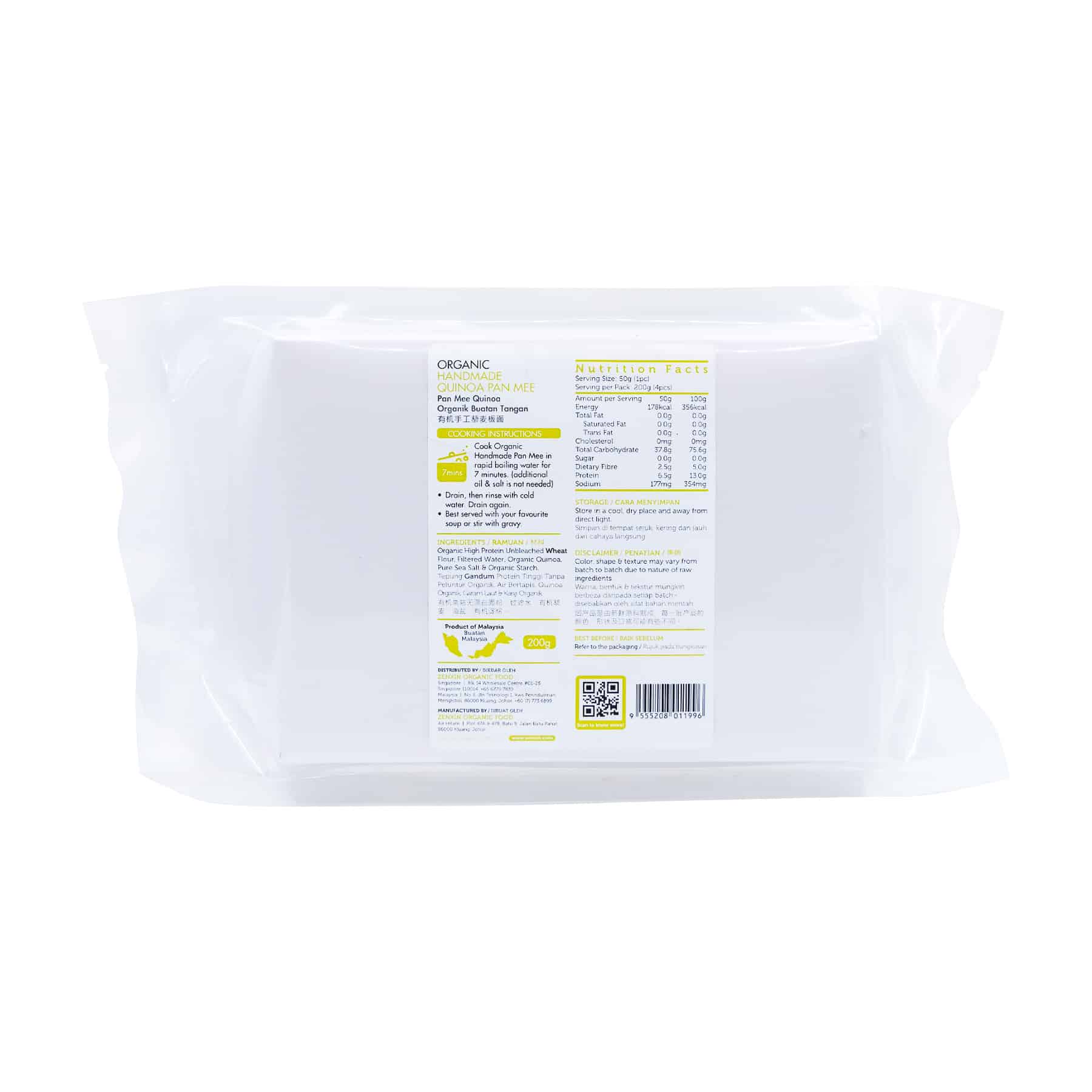 Made from high quality unbleached plain flour with high quality organic quinoa. Simply delicious and easy to cook. Produced in NASAA & MESTI certified facility, these pan mee are absolutely free from additives, artificial colouring & flavouring. Make a nutrition full meal with our delicious Pan Mee with your favourite soup or with gravy and ready to be enjoy with family.
