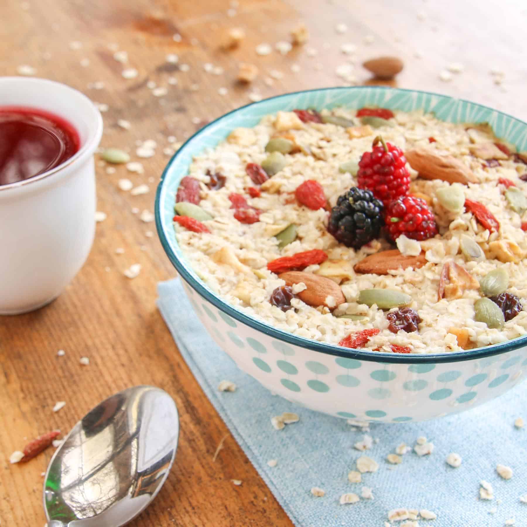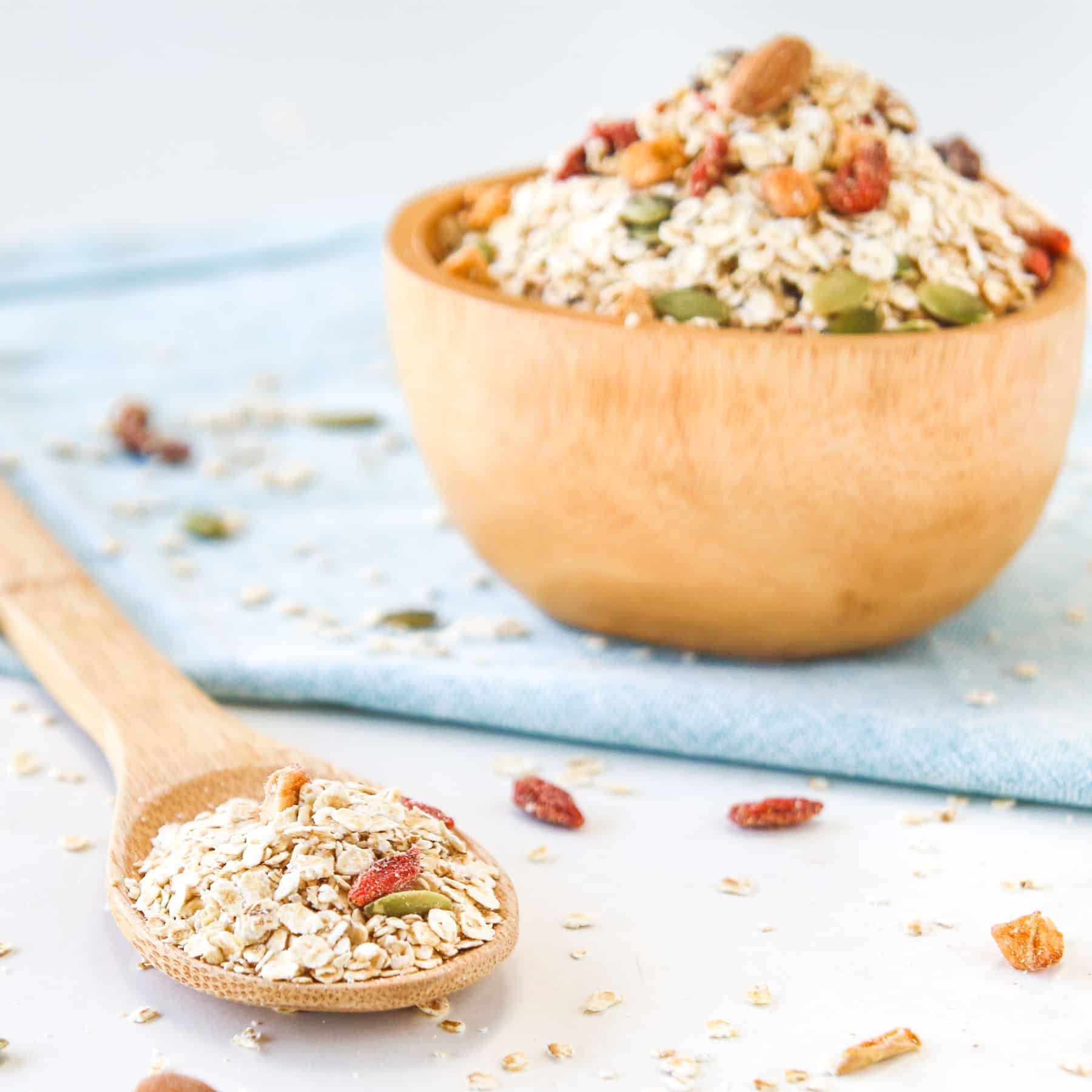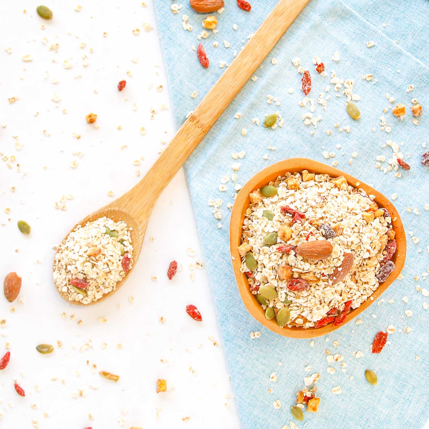 Organic Australian Quick Rolled Oat (Gluten), Organic Black Seedless Raisin, Organic Goji Berry, Organic Pumpkin Seed, Organic Apple Piece, Organic Raw Almond