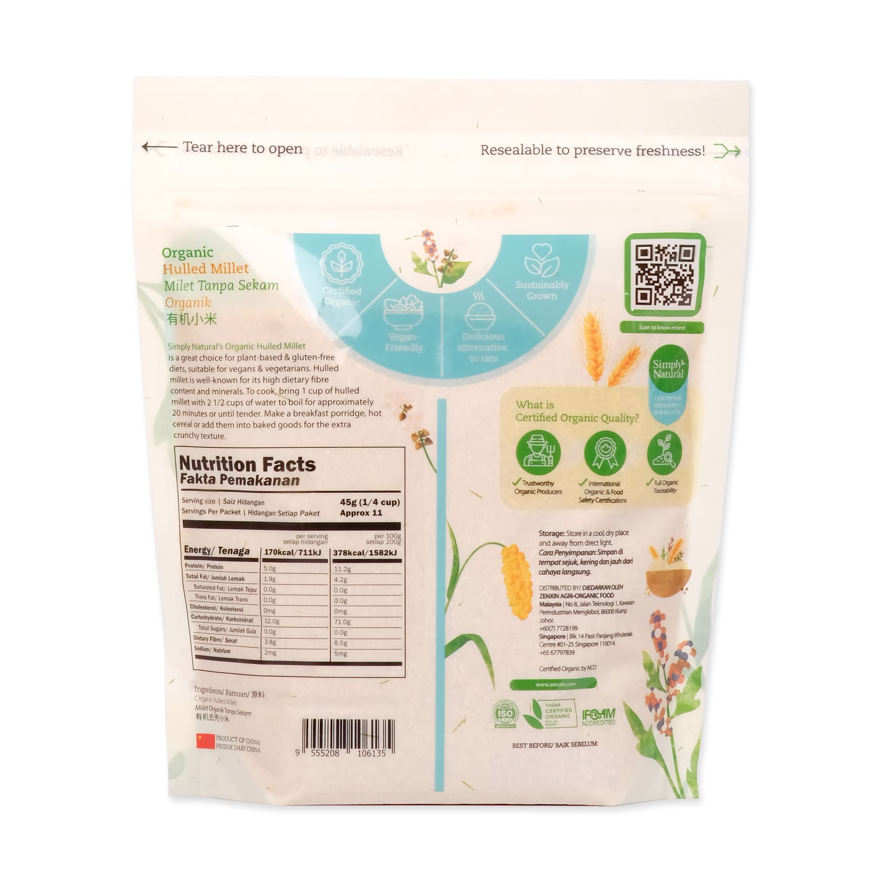 Organic Hulled Millet is rich in manganese, magnesium, phosphorus and copper. Provides serotonin to calm and soothe your moods. Is an alkaline food, meaning to say is easily digestible and helps maintain pH equilibrium in the body. Can be cooked in short period time. Have a mild, sweet flavour and blends well with other ingredients. Can be use as breakfast hot cereal or added into baked goods for an additional crunchy texture.