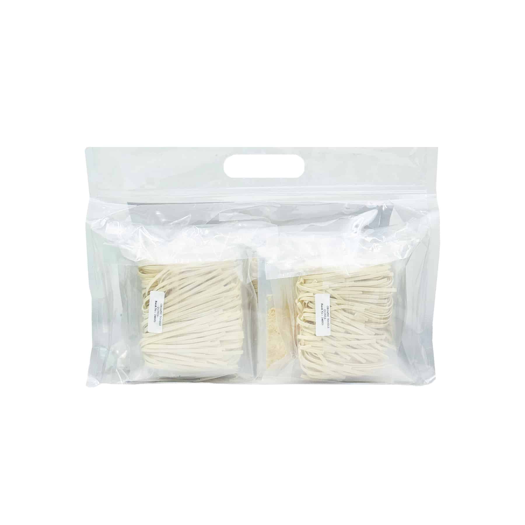 Noodles: Organic High Protein Unbleached Wheat Flour (gluten), Filtered Water, Organic Quinoa (3.0%), Pure Sea Salt, Organic Wheat Starch (gluten).