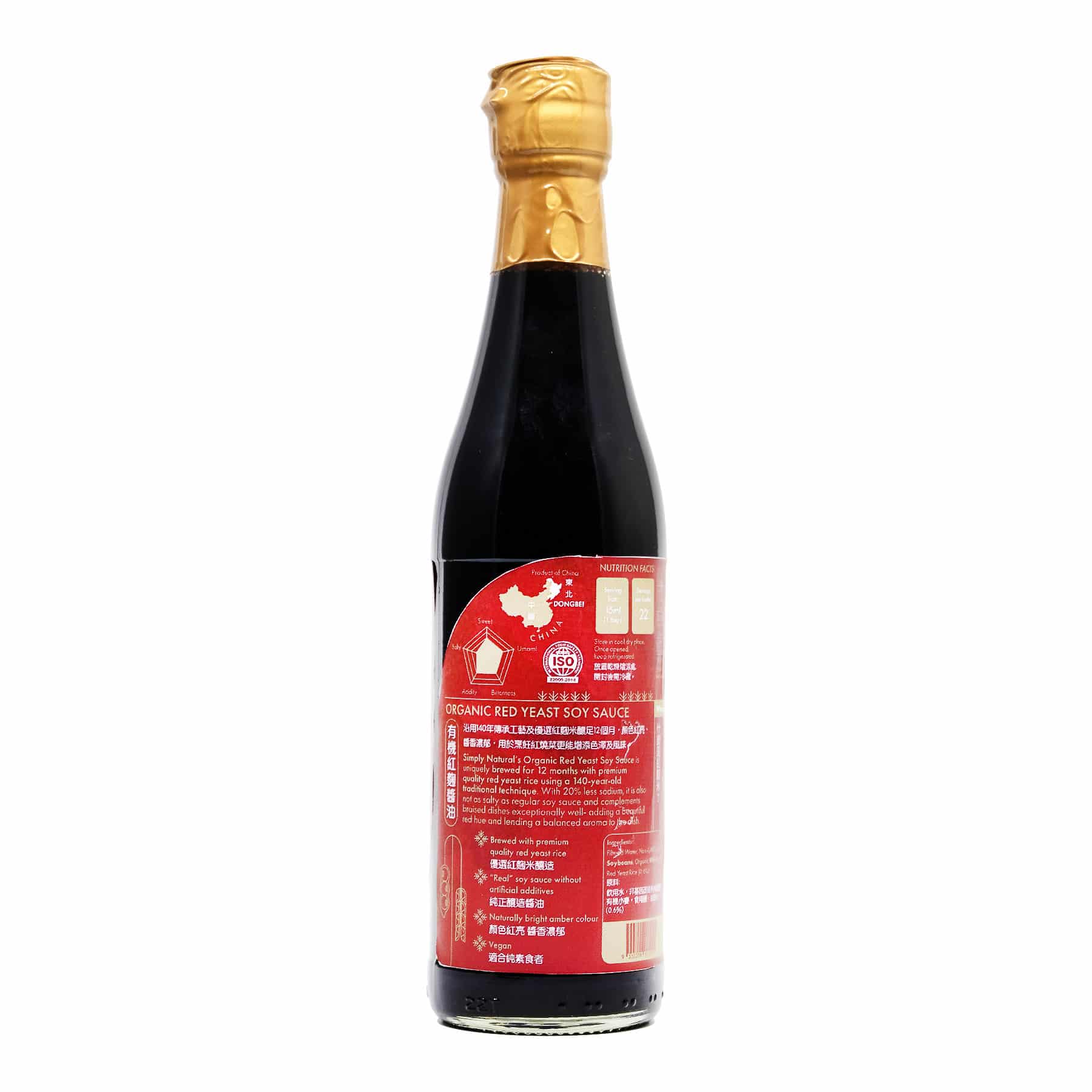 Simply Natural Organic Red Yeast Soy Sauce is naturally brewed for 12 months using 140 years traditional soy sauce fermentation technique. Made with high quality soybeans and wheat organically grown in Dongbei (Northeast China) and premium quality red yeast rice (Monascus purpureus), this red yeast soy sauce is pure without any artificial additives and has 20% less sodium than Premium Grade Organic Soy Sauce. It has naturally bright amber colour and full-bodied flavour enhanced by red yeast rice, that imparts a pleasant and subtle aftertaste to the soy sauce. This vegan friendly soy sauce has ≥1.5g/100 ml and ≥0.9g/100 ml total nitrogen and amino acid nitrogen (AAN) content respectively, which is much higher than 6g/100 ml total nitrogen content as per stipulated by Sg and Msia Food Regulation Standards. The higher the nitrogen content, the higher the grading of soy sauce.