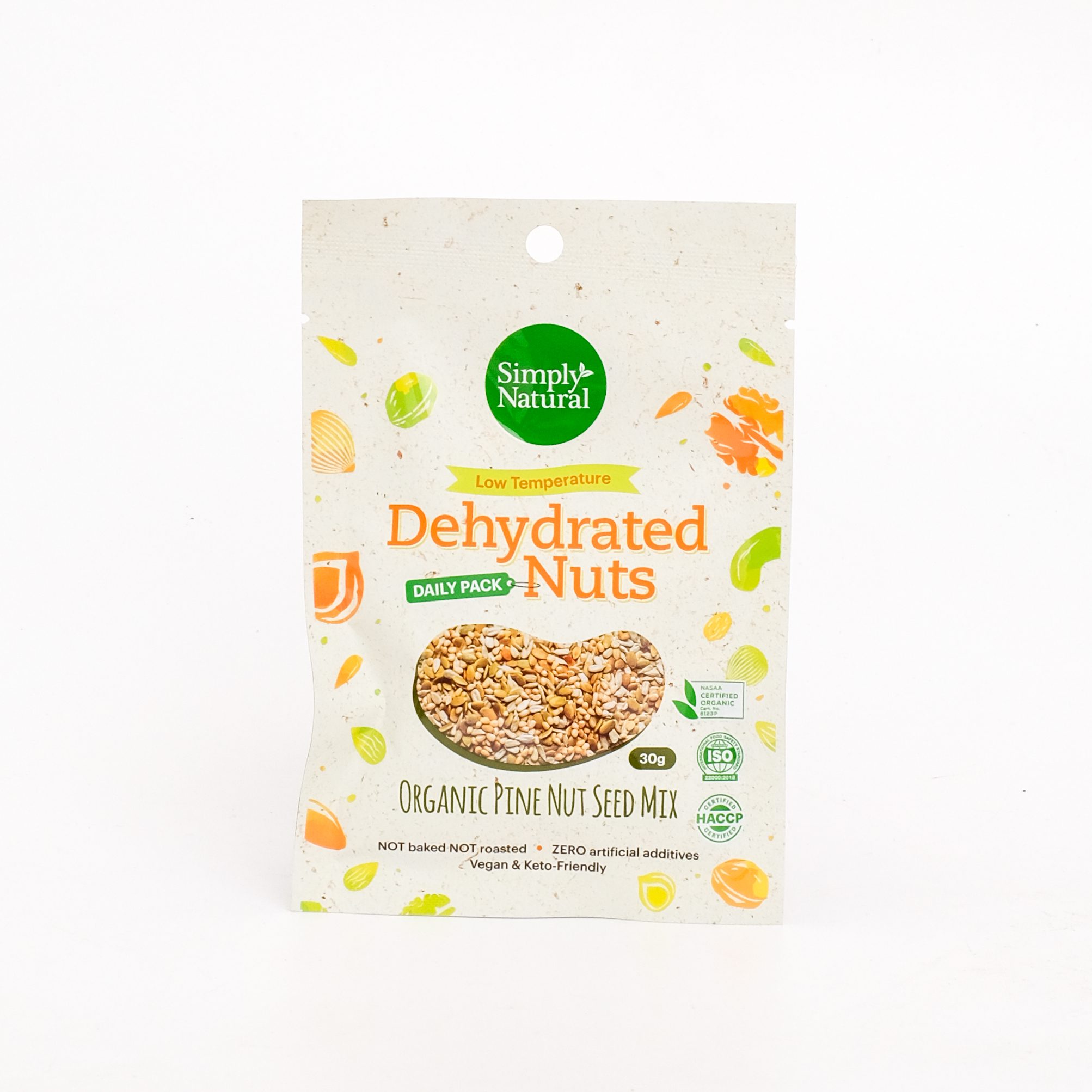 NOT baked NOT roasted, Simply Natural’s Dehydrated Pine Nut Seed Mix is dehydrated at a low temperature of 60°C for at least 15 hours to retain the heat-vulnerable ‘good’ fats present in nuts. It is made in XIN’s very own NASAA, ISO22000: 2018 & HACCP certified facility, with carefully selected premium quality ingredients, and guaranteed FREE from artificial additives, preservatives and colourings. You may taste the distinctive buttery flavour of unsalted & unsweetened pine nuts and mixed seeds, and we encourage you to incorporate them as part of your healthy diet. Less heaty, more goodness, definitely one of the best vegan & keto-friendly snacks of choice! Now comes in a pocket-sized packaging that contains a single serving of nuts for your daily need!