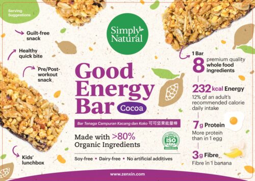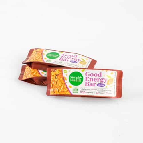 Simply Natural Good Energy Bar Cocoa is a nutrient-packed snack bar loaded with protein and dietary fibre. Just one pocket-sized bar contains more protein than in 1 egg and dietary fibre equivalent to that in a banana. Made with more than 80% certified organic ingredients, including organic pea protein powder, it is soy-free, dairy-free and has absolutely no artificial additives and no refined sugar. Perfect as a quick satiating healthy bite that fuels you up right away, especially after work-out or in the midday.