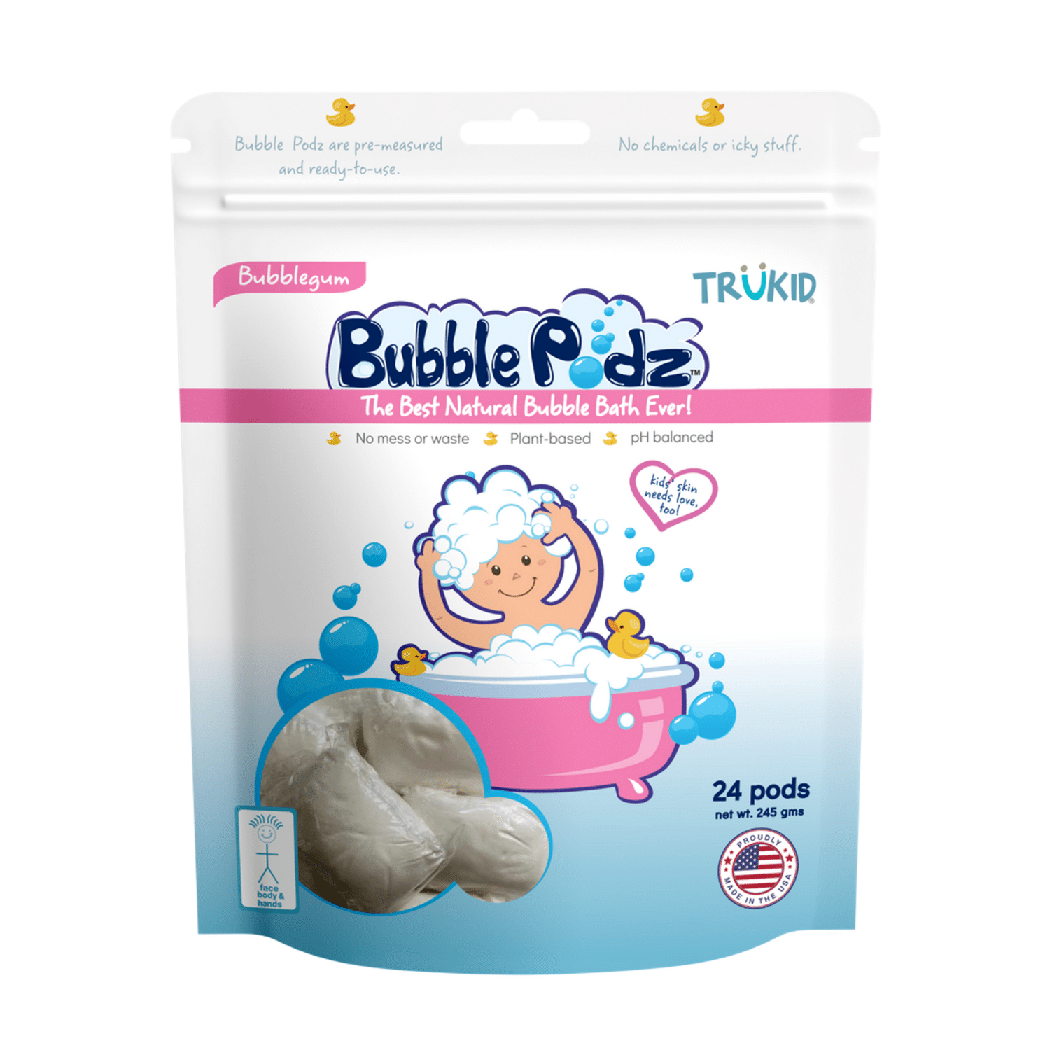 A great childhood is made of many small joys, and for some lucky kids, bubble baths are included. But your child’s eyes water, their skin reddens, and they swear that they’ll never bathe again! Drain the tub and try again with TruKid Bubble Podz. Your specially formulated bath bubbles for kids are full of natural ingredients and designed to be gentle on irritable skin.